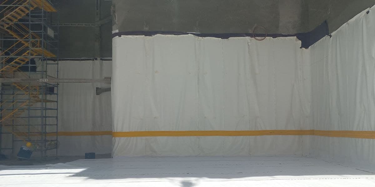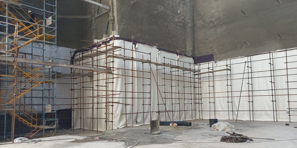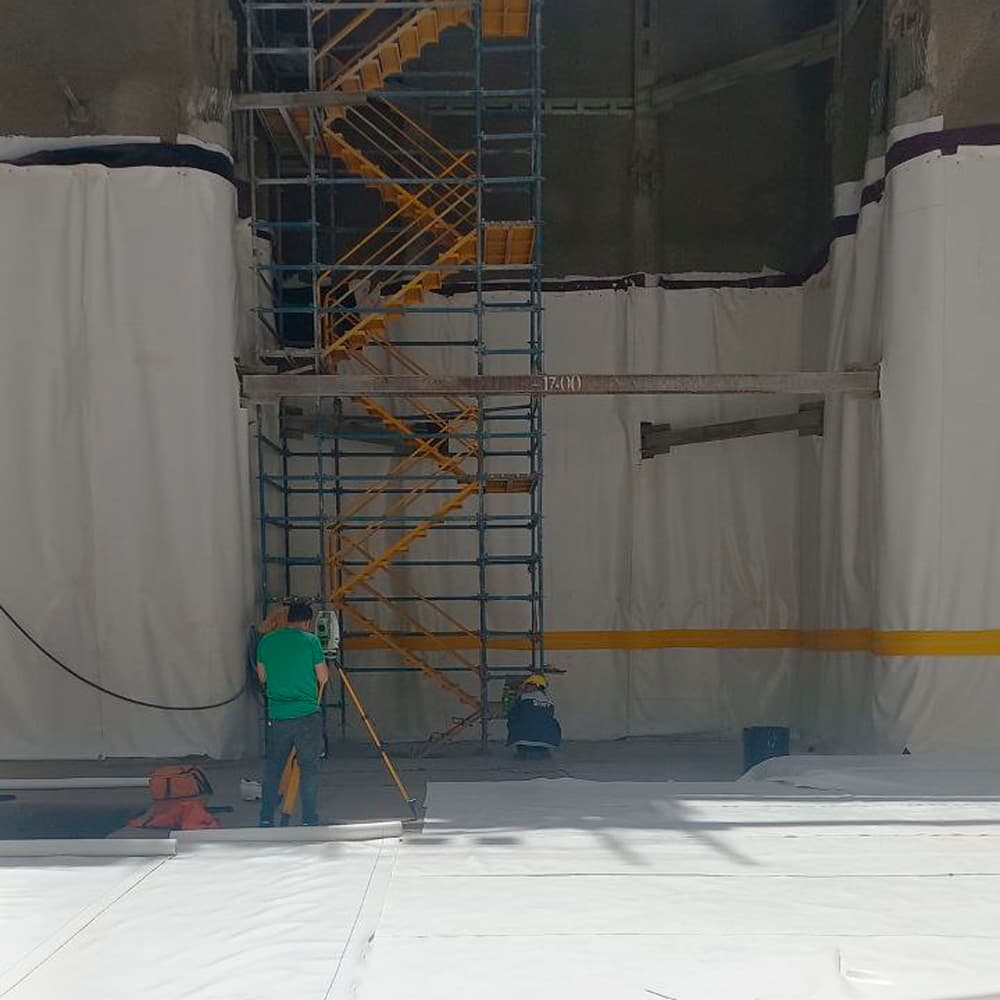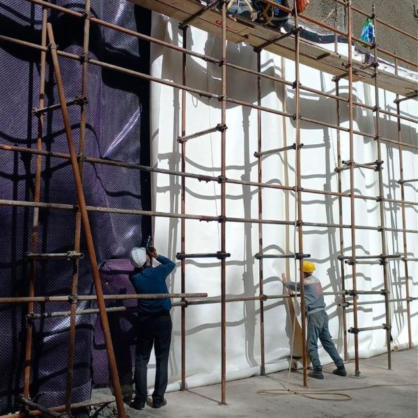 در این پروژه با توجه به قرار گرفتن سطح آب زیرزمینی پایین تر از سطح فونداسیون اجرای عایق جداره ابتدا توسط لایه محافظ ژئوتکستایل و پس از آن لایه زهکش پلیمری حفره دار و لایه PVC کار گردید و در نهایت جهت یکپارچه سازی با کف لایه محافظ ژئوتکستایل ۵۰۰ و پس از آن یک لایه ژئوممبران کار گردید.