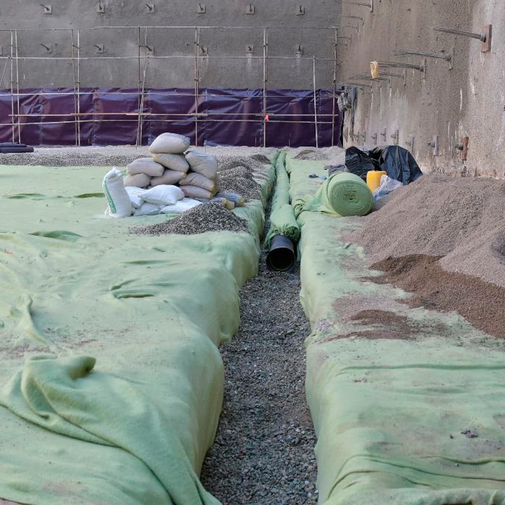 براساس طراحی ارائه شده در این پروژه روی دیوارههای پایدار از یک لایه ژئوتکستایل فیلتر با وزن واحد سطح ۳۰۰ گرم و یک لایه زهکش حفرهدار پیشساخته پلیمتری با وزن واحد سطح ۶۰۰ گرم مورد استفاده قرار گرفته تا آب و تراوشات سطحی را به کانالهای زهکشی حفاری شده در قسمت کف منتقل و از طریق آن به چاه زهکشی جذبی اصلی هدایت نماید.