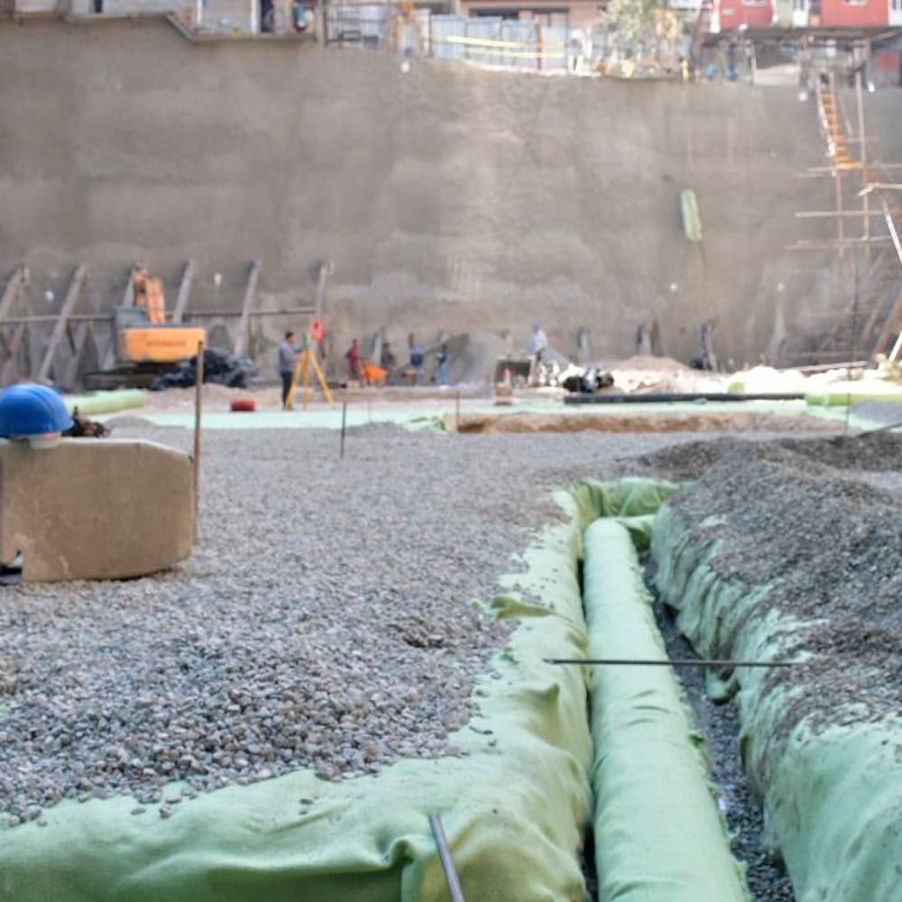 در این پروژه جهت بهبود عملکرد زهکشی در قسمت کف گود نیز از کانالهای میانی و بتوی شنی استفاده شده که جزئیات آن در شکل زیر نمایش داده شده است همچنین در قسمت چالههای آسانسور نیز به دلیل حساسیت نسبت به نشت و نفوذ آب از یک لایه ژئوممبران PVC با ضخامت ۲ میلیمتر به همراه لایه ژئوتکستایل محافظ با وزن واحد سطح ۵۰۰ گرم بهره برده شده است.جهت دستیابی به توضیحات تکمیلی میتوانید از وبسایت شرکت به آدرس: www.sepantagroup.org بازدید نمایید.